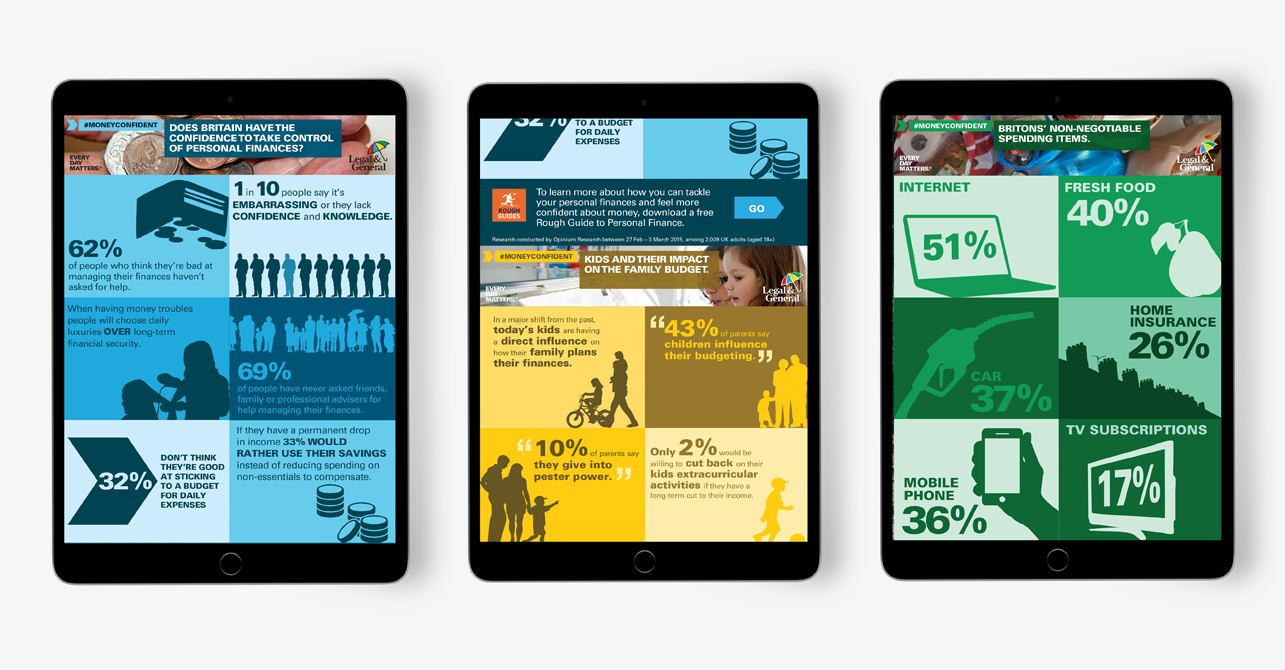Digital campaign run in partnership with the Rough Guides to help people become more aware of their finances and also encourage them to be more proactive when it comes to personal finance. Click throughs direct consumer to a series of guides which could help people make the right financial decisions for them and also use as an informative tool when financial planning. Design for front end of Google Money Hangout series and also a series of online infographics which ran in conjunction to the Money Hangouts and Rough Guides to Finance illustrating the general spending habits of Britons today.